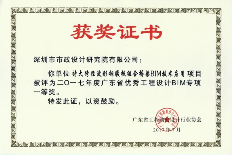 近日,我公司“特大跨径波形钢腹板组合桥梁BIM技术应用”项目被评为2017年度广东省优秀工程设计BIM专项一等奖。
