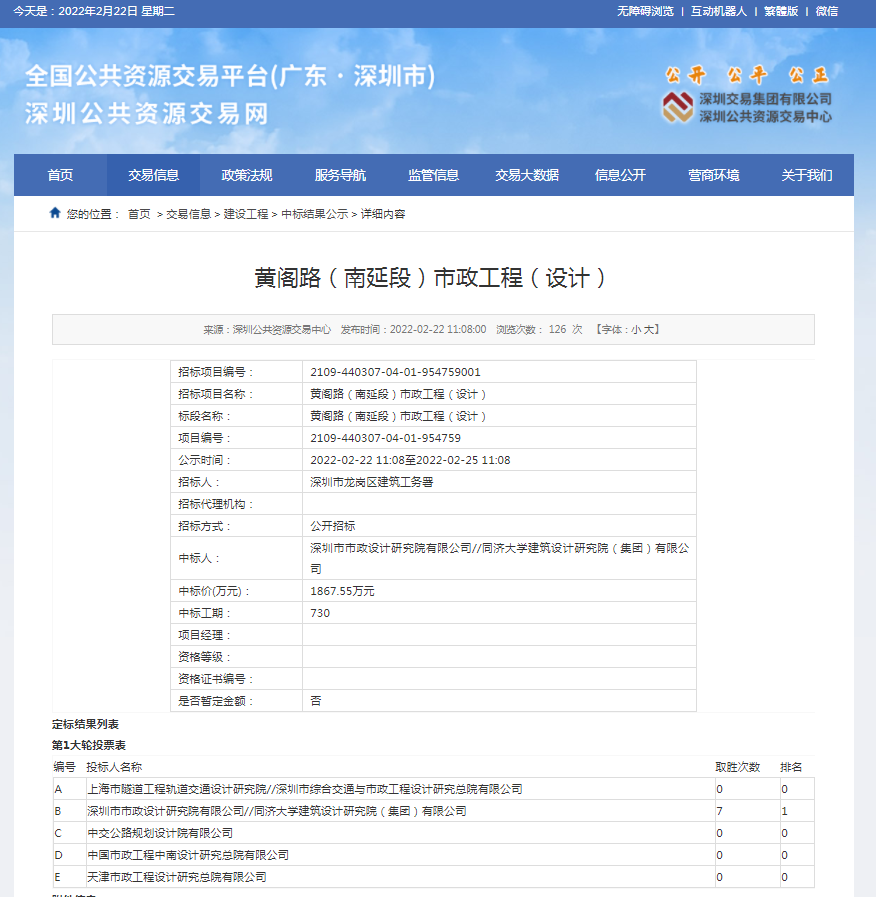 2022年2月22日,经深圳市公共资源交易中心中标公示通过,深圳市政院与同济大学建筑设计研究院(集团)有限公司(联合体)在深圳市龙岗区建筑工务署黄阁路(南延段)市政工程(设计)项目公开招标中成...
