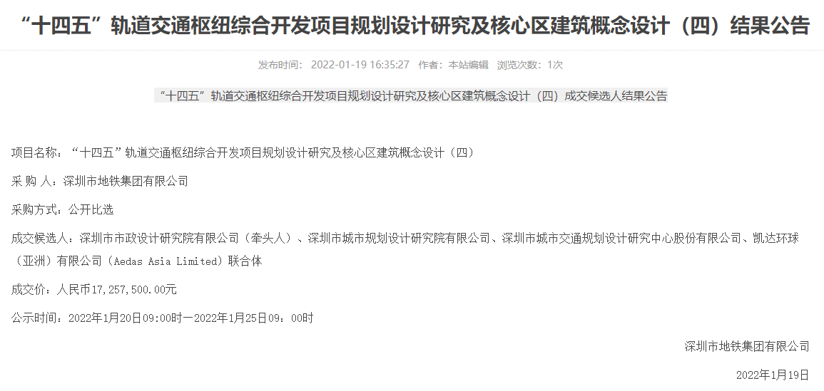 日前,经深圳市地铁集团有限公司官网中标公示通过,深圳市政院轨道交通院作为联合体牵头方参投的“‘十四五’轨道交通枢纽综合开发项目规划设计研究及核心区建筑概念设计(四)”喜获中标,中标金额...